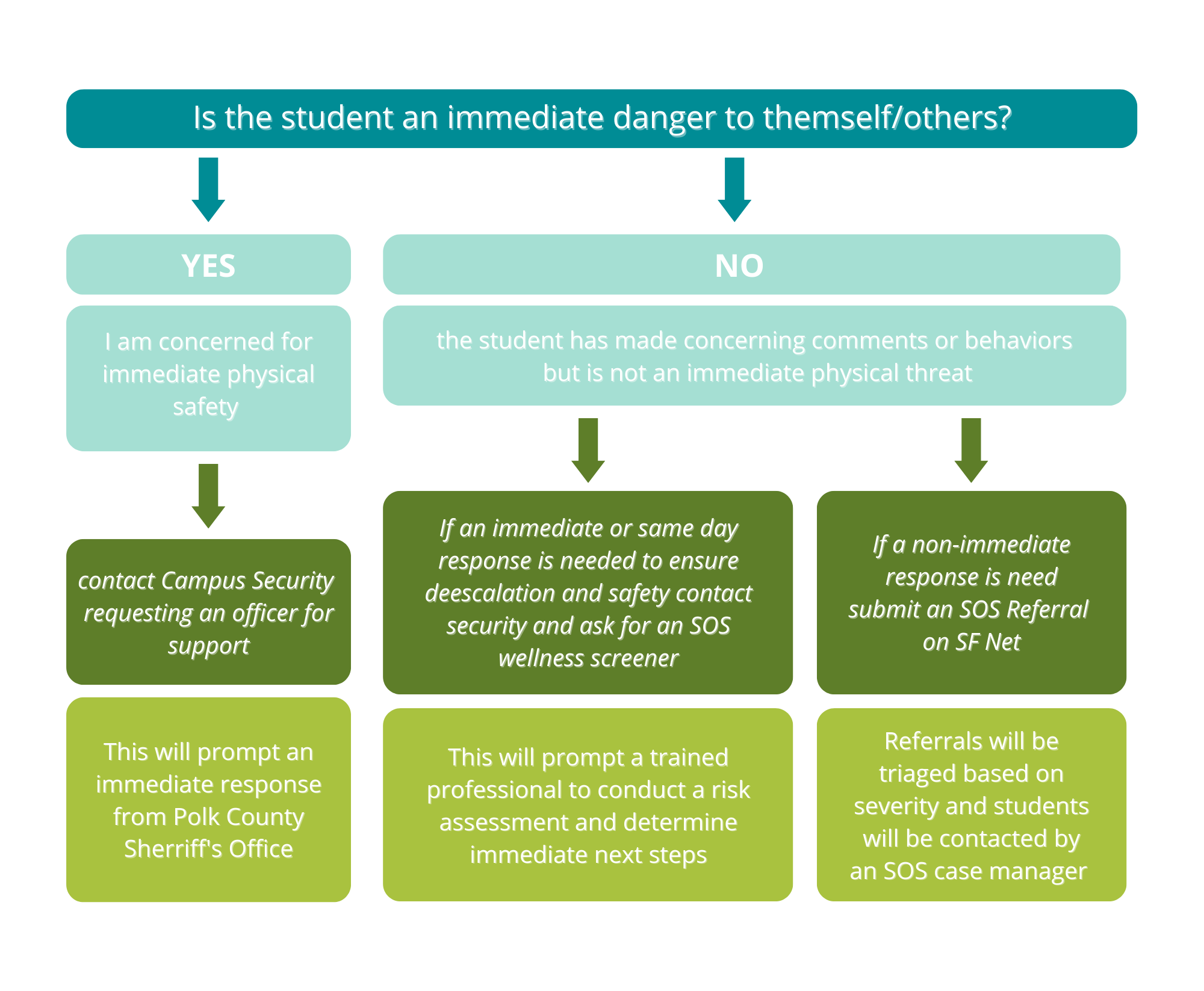 Responding to Student CrisesIf you are with a student who is experiencing a crisis know you’re not alone. We have a team of people on campus who are available to respond 24/7. You can remain with the student and call campus security. Campus Security will call a trained responder to come to be with you and the student. If you are concerned for a student’s well-being, do not delay calling. We can respond more effectively when we know in the moment rather than seeking to follow up hours later. If the student begins to walk away from you, please don’t force them to stay. Instead, note where they are heading and give the information to security. Security can be reached by dialing extension 5190 or calling 863-667-5190. Below is a helpful resource to determine what support is needed. The need to request an SOS wellness check may be prompted when a student: